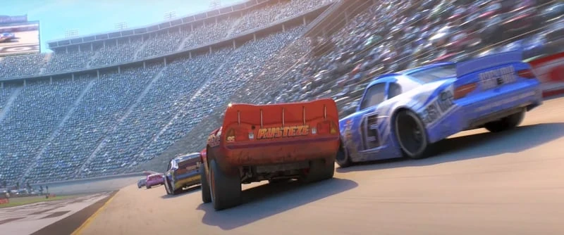 Carl Clutchen being passed by Rayo McQueen during the Dinoco Light 350