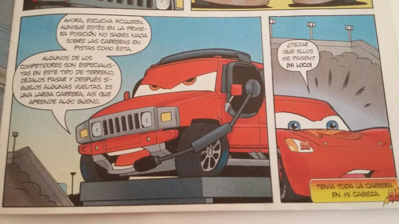 - "Ahora escucha, McQueen. Aunque estás en la primera posición no sabes nada sobre las carreras en pistas como esta"