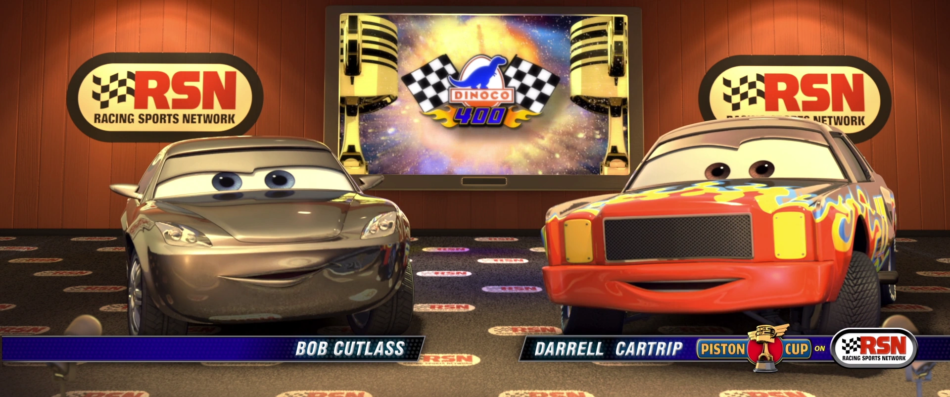 En Cars, Darrell y Bob Cutlass comentan las 400 de Dinoco de 2005. Al comienzo de la carrera, Darrell y Bob presentan a El Rey, Chick Hicks y El Rayo McQueen a la audiencia, explicando que los tres autos están empatados con una puntuación de 5013 puntos y que el ganador de la carrera se llevará a casa la Copa Piston. Están conmocionados por el accidente de 33 autos causado por Chick Hicks y se sorprenden aún más cuando McQueen logra esquivar cuidadosamente el accidente, evitando el contacto. Cuando la carrera da como resultado el primer empate a tres bandas en la historia de la Copa Piston, Darrell y Bob están extasiados, parloteando con entusiasmo mientras intentan determinar el ganador.