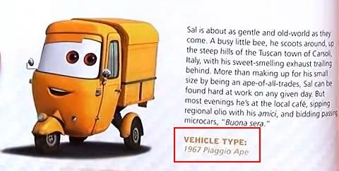 "Sal es tan gentil y clásico como cualquiera. Es una abeja muy ocupada que corre por las empinadas colinas de la ciudad toscana de Carsoli, Italia, dejando atrás su oloroso escape. Sal compensa su pequeño tamaño siendo un mono de todo, ya que se lo puede encontrar trabajando duro todos los días. Pero la mayoría de las noches está en el café local, enviando aceite regional con sus amici y regalando a los microcoches que pasan "Buona sera"[1]