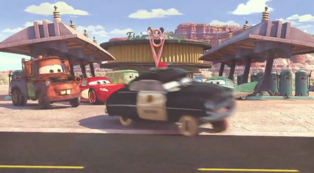 En Cars, mientras Rayo McQueen acelera por lo que cree que es la Interestatal 40 (pero en realidad es la Ruta 66) en busca de ayuda después de ser separado de su transportador, McQueen pasa rápidamente al Sheriff, que está durmiendo junto al letrero entre Radiador Springs y Ornament Valley. El sheriff persigue a McQueen, pero comienza a fracasar debido a la fatiga del metal y a conducir a velocidades tan altas. McQueen inicialmente piensa que Sheriff puede ayudarlo, pero cuando esto último le sale mal, confunde el sonido con disparos (ya que Sheriff nunca está armado en toda la serie) y comienza a entrar en pánico, intentando evadir a Sheriff. McQueen atraviesa Radiador Springs y derriba la estatua del fallecido fundador de la ciudad, Stanley. McQueen procede a tirar accidentalmente la estatua a través de la carretera principal, rompiéndola. La persecución termina cuando McQueen es detenido por un cable telefónico, lo que permite al Sheriff alcanzarlo.